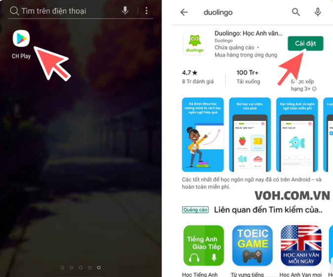Bước 1: Mở điện thoại Android của bạn lên và vào CHplay > tìm kiếm từ khóa Dulingo