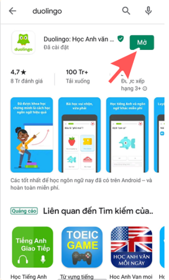 Bước 2: Chọn vào cài đặt để cài đặt ứng dụng Duolingo vào điện thoại của bạn