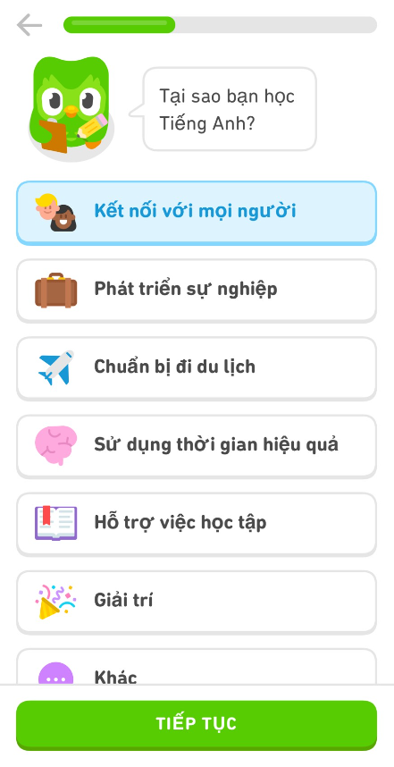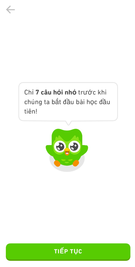 Bước 5: Trước khi đến với ứng dụng này, cú Duo sẽ khảo sát trước về ” năng lực của bạn, cũng như một số thứ khác thông qua ” chỉ 7 câu hỏi nhỏ trước khi chúng ta bắt đầu bài học đầu tiên” mà cú Duo sẽ đưa ra cho bạn.