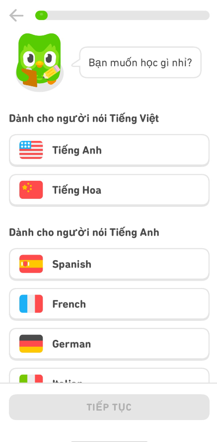 Bước 6: Bạn có nhiều lựa chọn ngôn ngữ, nhưng bạn đang có sẵn tiếng Việt thì hai lựa chọn học tiếng Anh hoặc học Tiếng Hoa. Mình chọn học Tiếng Anh
