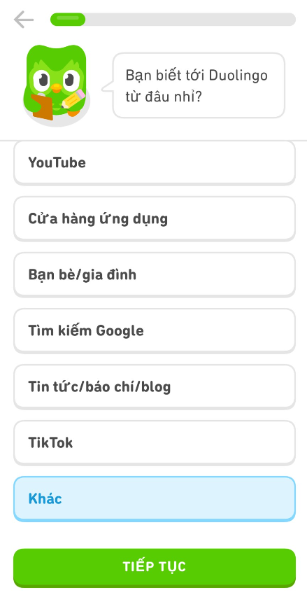 Bước 7: Cú Duo sẽ hỏi bạn biết tới Duolingo thông qua đâu, bạn có thể tùy chọn xem bạn biết tới cú Duo qua đâu nhé, mình chọn khác và tiếp tục