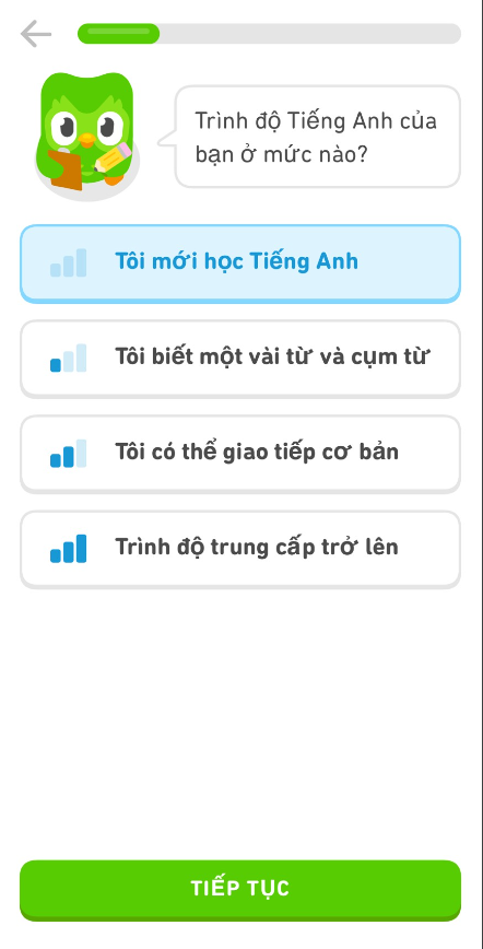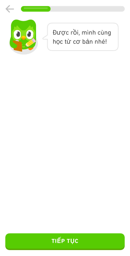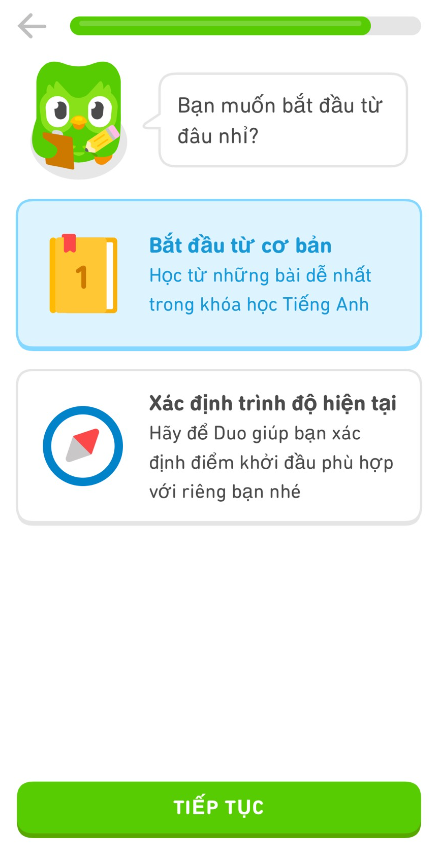 Bước 11: Cú Duo sẽ hỏi mình bắt đầu từ đâu, bạn có thể xác định trình độ hiện tại của bạn, với mình thì mình sẽ bắt đầu từ cơ bản. Bởi cảm giác lúc đầu dễ dàng sẽ tạo cho mình một hứng thú hơn là bắt đầu với nhiều sự khó khăn