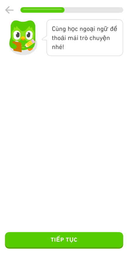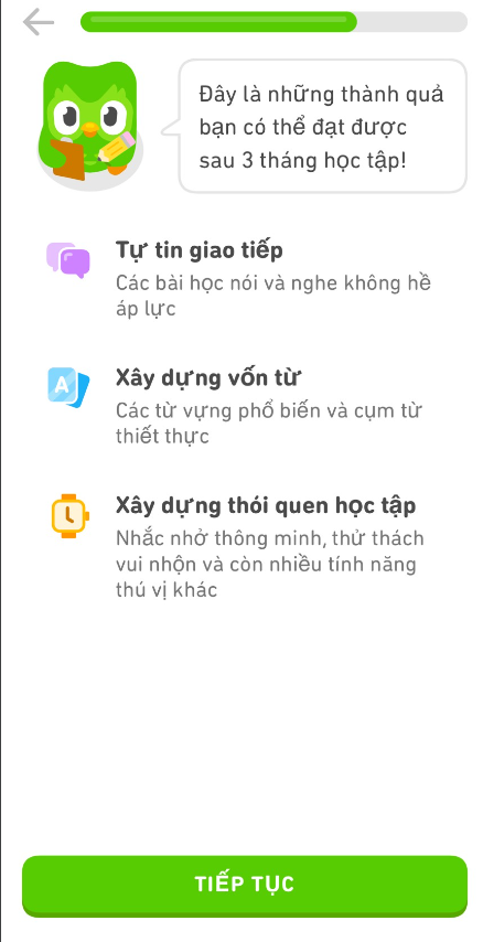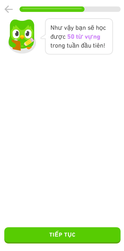 Cú Duo cũng tính toán cho mình, theo đó khi học qua ứng dụng Duolingo này thì mình có thể học được 50 từ vựng đầu tiên nhé