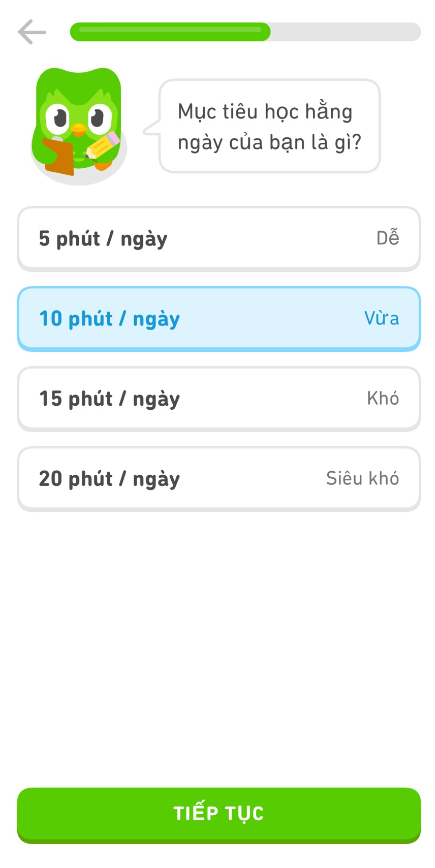 Có nhiều lời khuyên hãy dành ít nhất 30 phút để học, nhưng có lẽ mình khá bận và có thể dành từ 10 đến 20 phút một ngày mà thôi. Vì thế, để đảm bảo yêu cầu mình sẽ chọn mức 10 phút 1 ngày