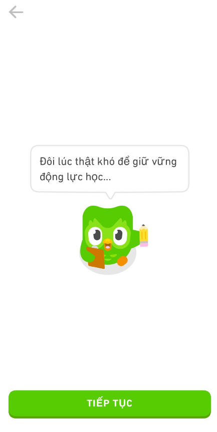 Bước 12: Thông qua cú Duo, Duolingo cũng nhắc nhở mình rằng ” Đôi lúc thật khó để giữ vững động lực học…” điều này quả nhiên đúng, việc học thì đơn giản, nhưng kiên trì theo đuổi ít nhất trong 3 tháng và sau đó là dài hơn thì quả là một khó khăn, đòi hỏi một sự kiên trì nhất định nữa.