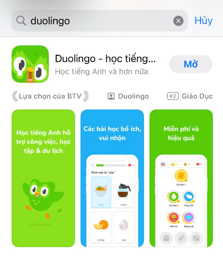 Bước 1: Trên iPhone bạn mở App Store ra nhé, sau đó tìm kiếm cụm từ ” Duolingo”